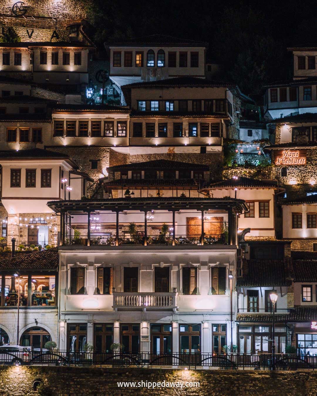 Fun fact: When in Berat, you might see a big white palace or castle-looking building towards the end of Republic Boulevard. But it’s not a palace at all. It’s the Hotel Colombo! We saw it from the castle multiple times and always wondered what it was, especially since it shone so brightly at night.